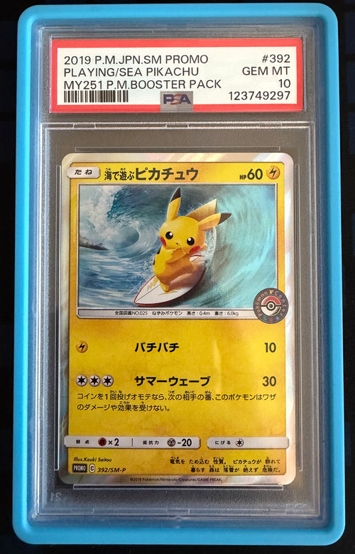 2019 POKEMON JAPANESE SM PROMO #392 PLAYING IN THE SEA PIKACHU PSA 10